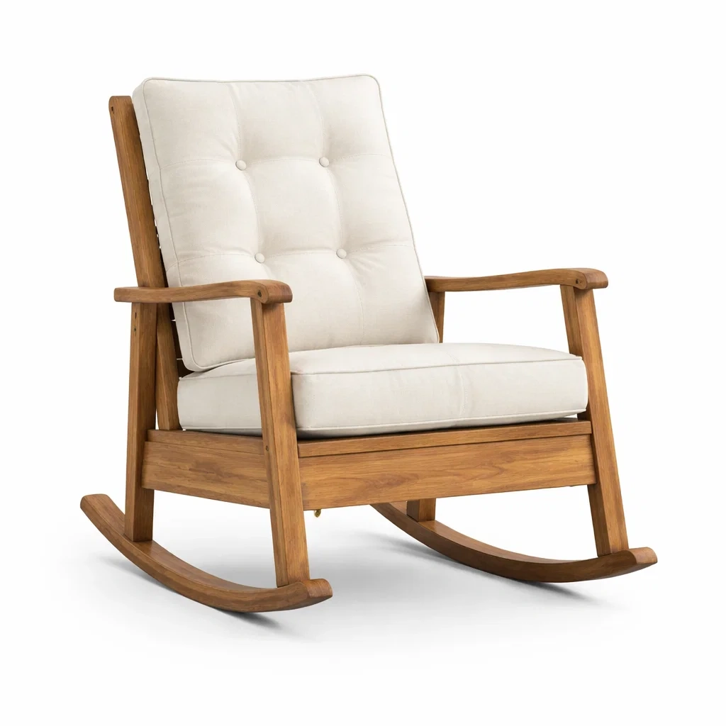 Der Schaukelstuhl besteht aus einem hochwertigen Teakholzrahmen und einem abnehmbaren Leinenkissen. Der Stuhl hat eine Höhe von 100 cm, eine Breite von 75 cm und eine Tiefe von 80 cm. Das Nettogewicht beträgt 15 kg. Der Stuhl ist nur für den Innenbereich geeignet. Maximale Tragkraft: 120 kg.