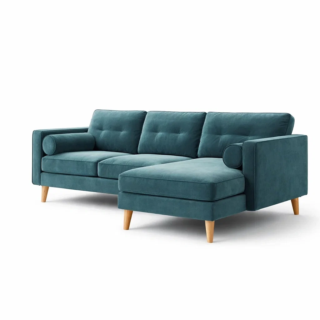 Dieses Ecksofa ist mit einem hochwertigen Samtbezug ausgestattet. Die Kissen sind mit Polyätherschaum gefüllt. Die Beine sind aus massivem Holz gefertigt.